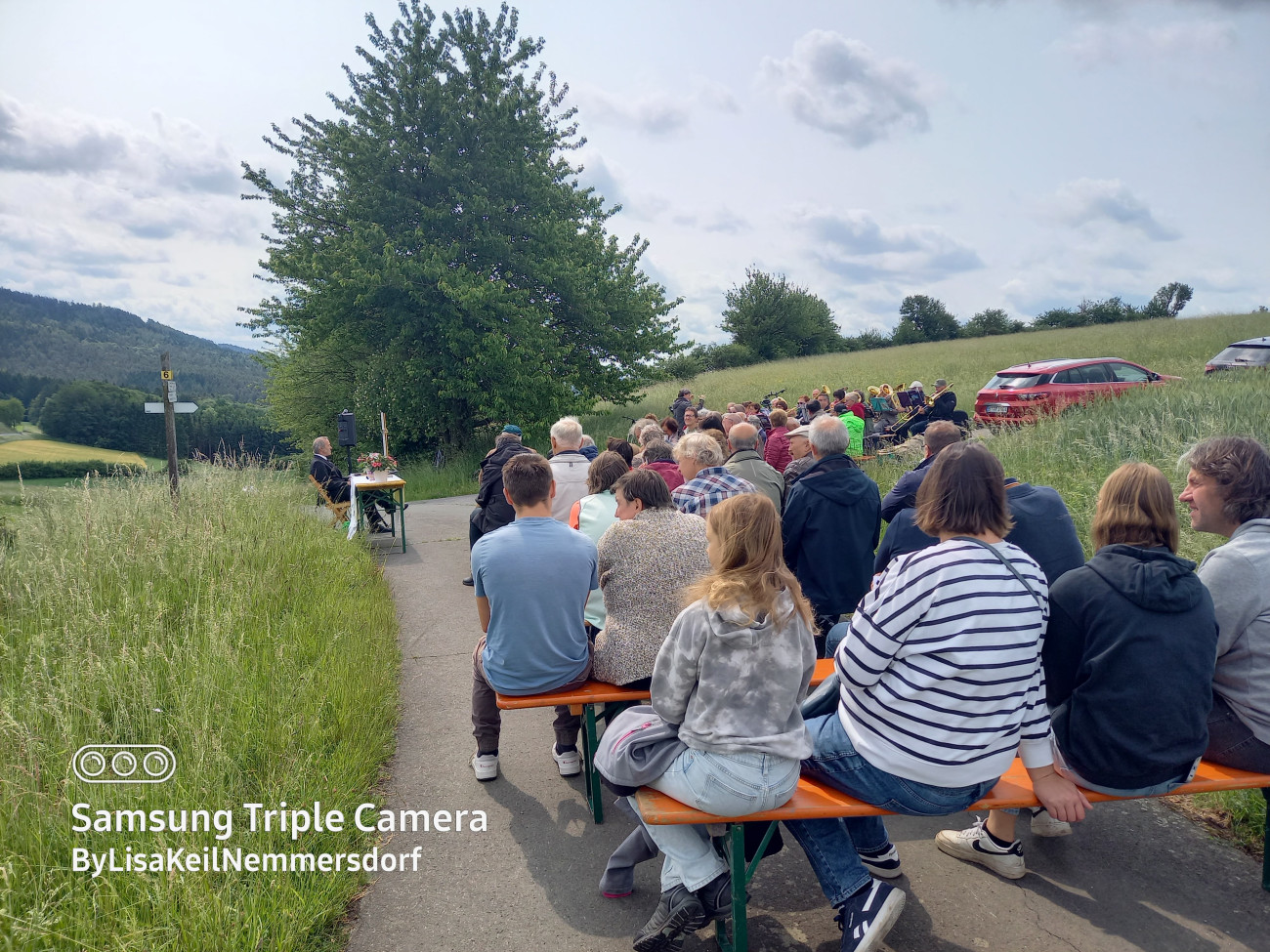 Bei schönem Wetter versammelten sich am Pfingstmontag die Gottesdienstbesucher auf der Höhe des Nemmersdorfer Kreuzsteins. Mit gemeinsamen Posaunenchor aus den Kirchengemeinden Nemmersdorf und Warmensteinach wurde der Gottesdiest an Pfingstmontag gefeiert. Die Lieder erklagen auf der Höhe und unter freiem Himmel. Draußen in der Natur lässt sich die Schönheit der Schöpfung am besten genießen, besonders mit einer guten Aussicht und einem herrlichen Ausblick über Dörfer und Landschaft.